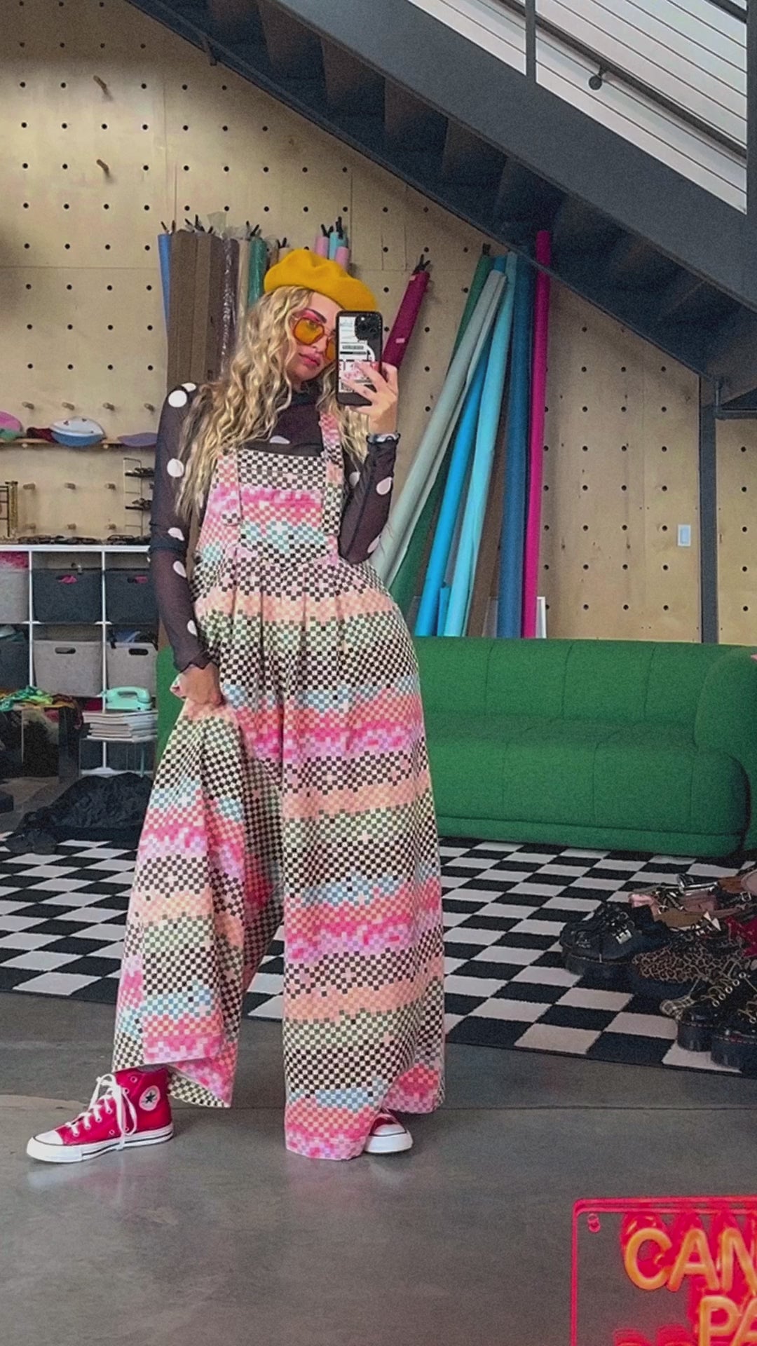 Big Feelings Oversized Denim Overalls in Grunge Rainbow Checkerboard
