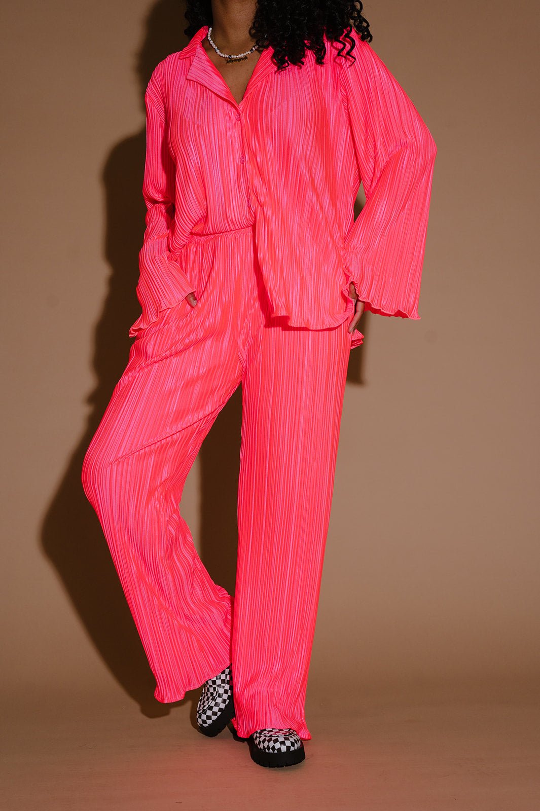 Long Sleeve Plissé Set in Electric Pink