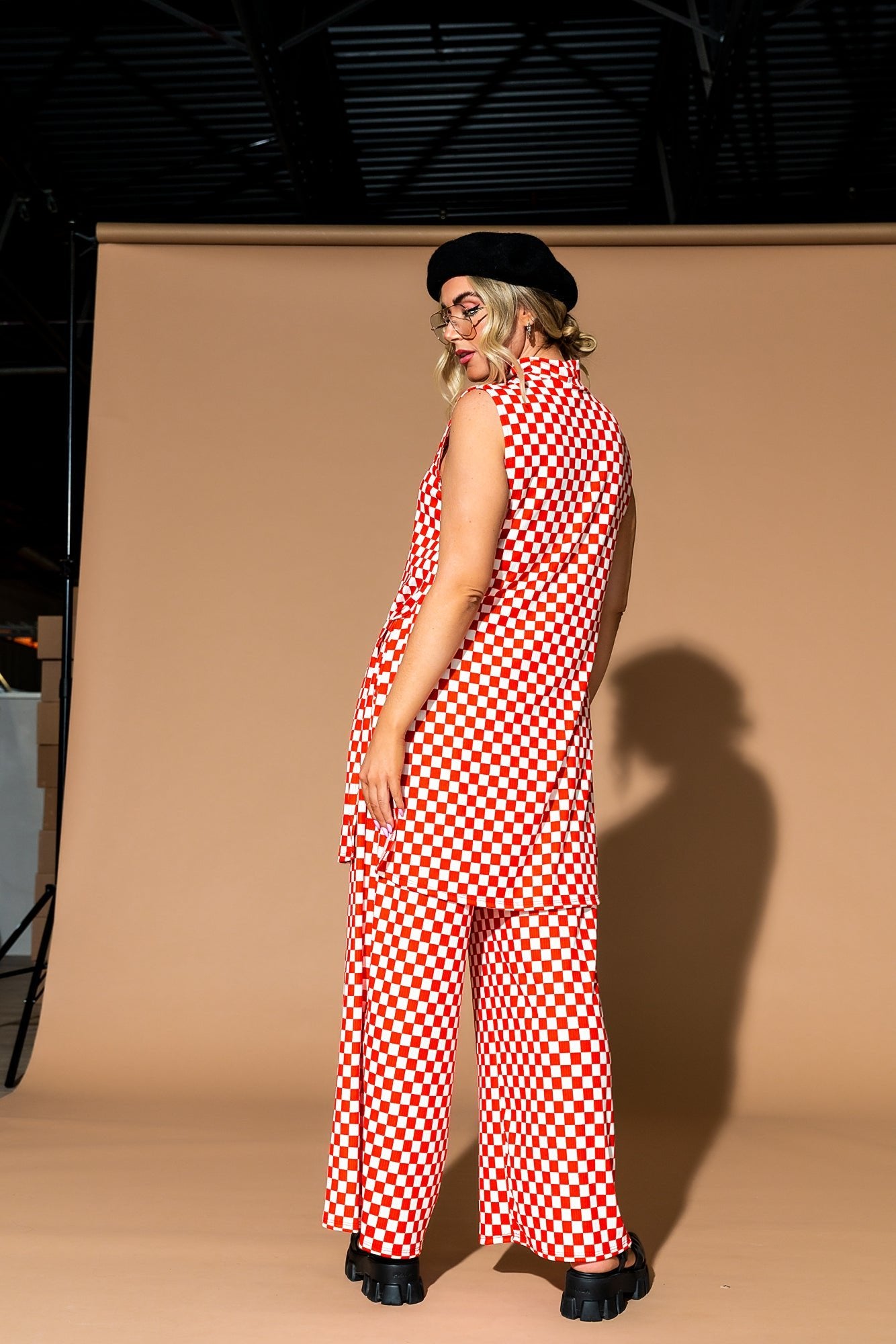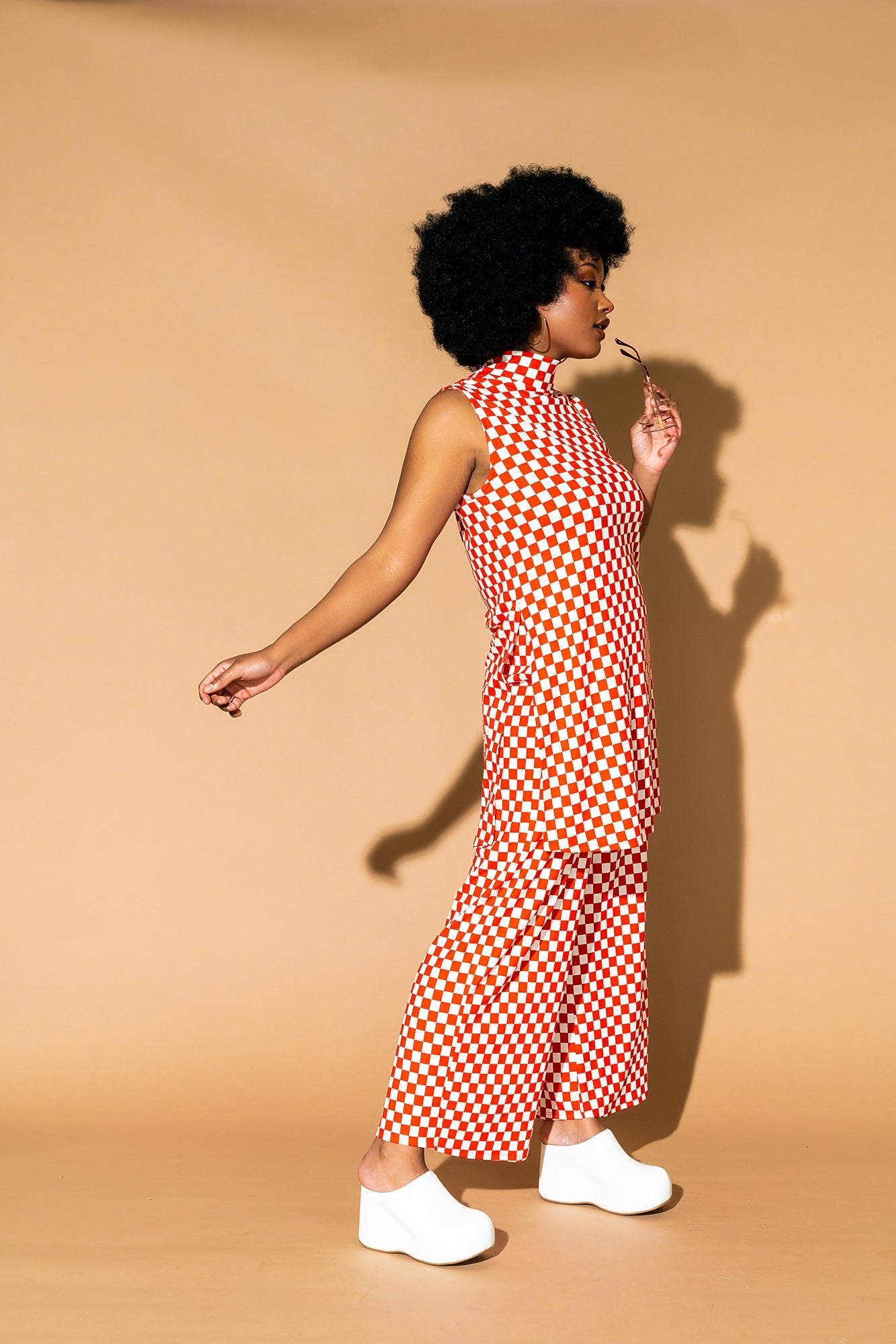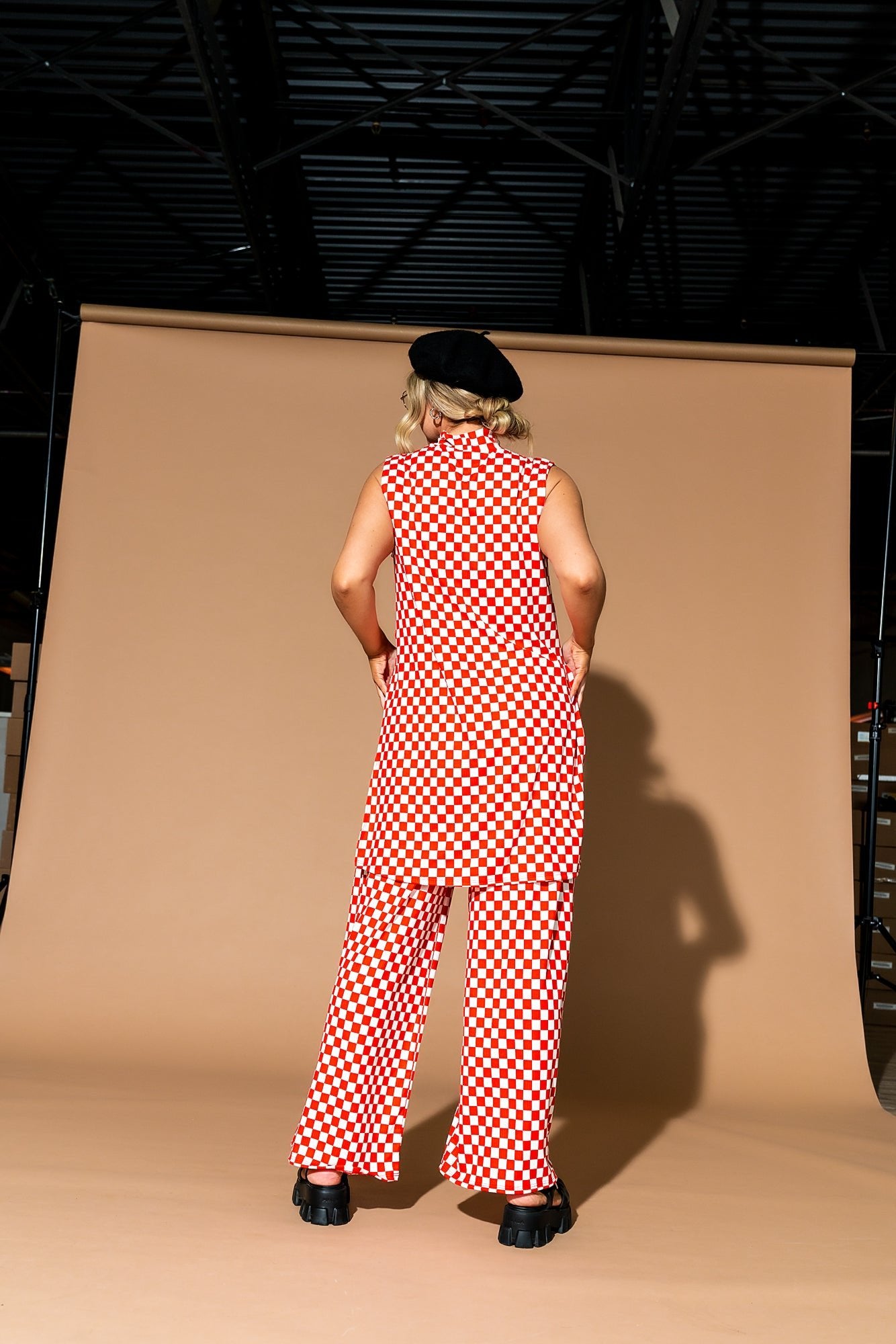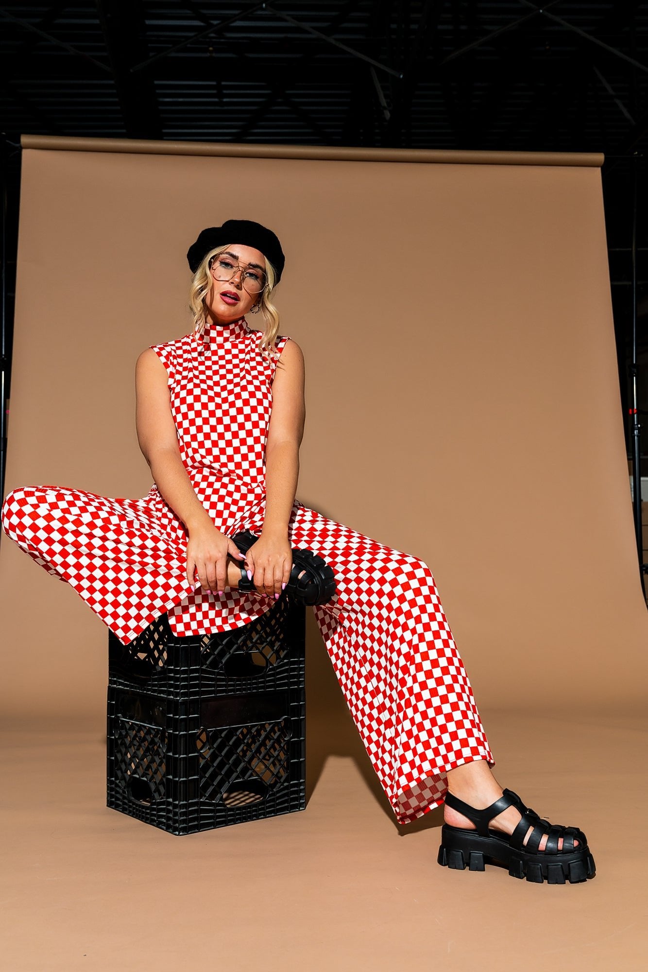 Gigi Sleeveless Ribbed Playsuit in Retro Red Check
