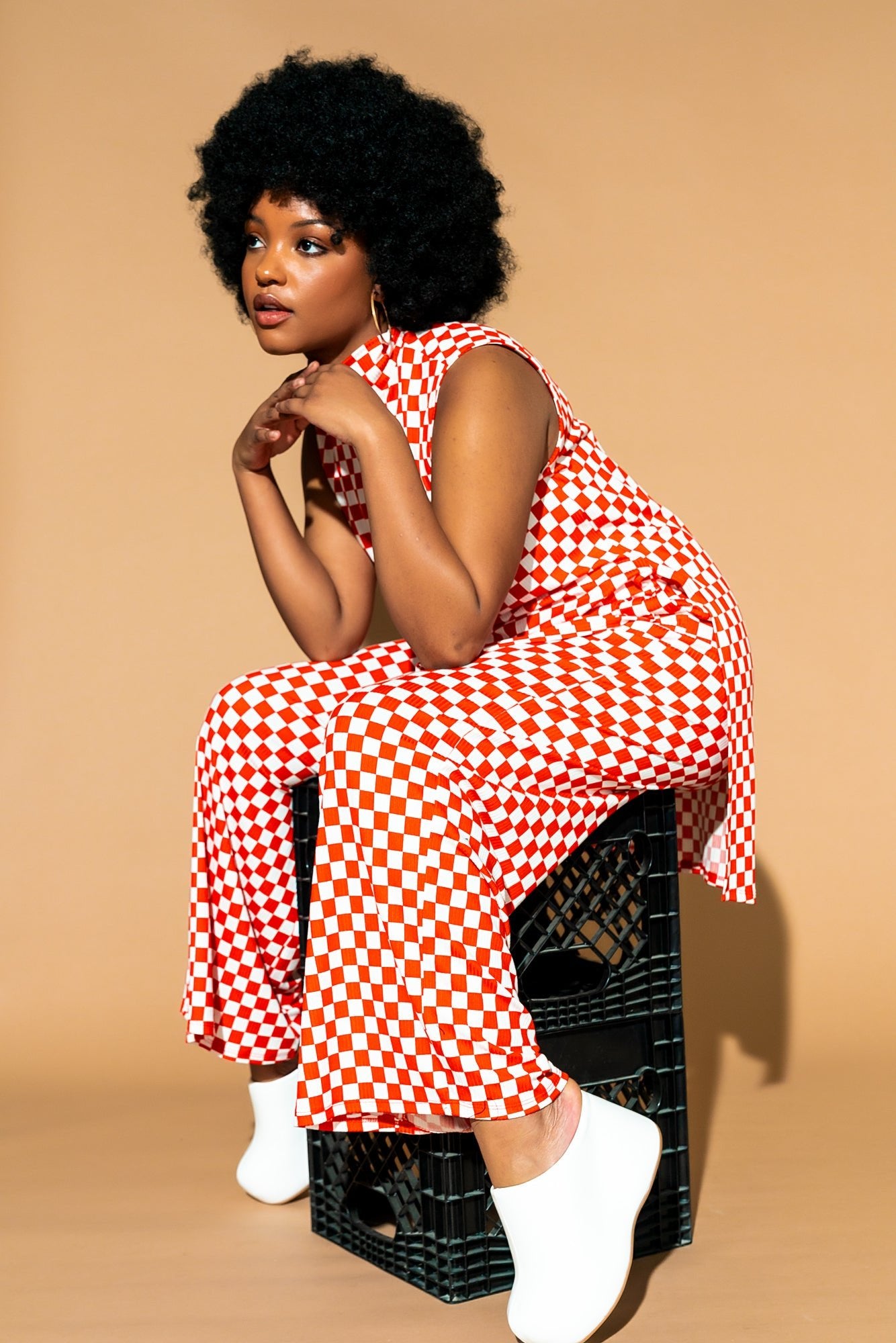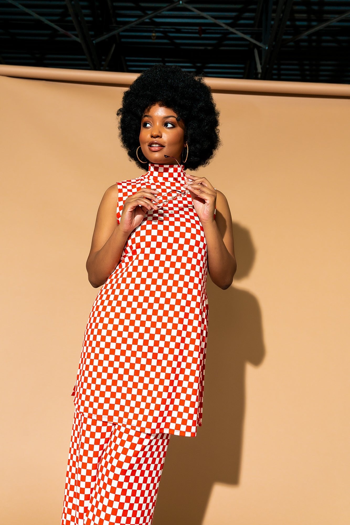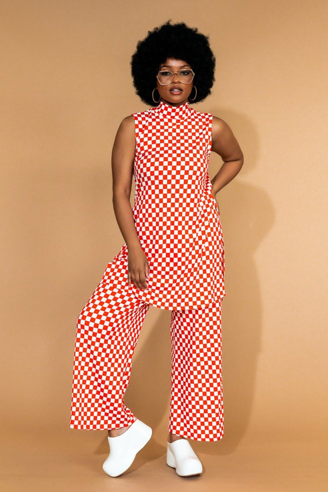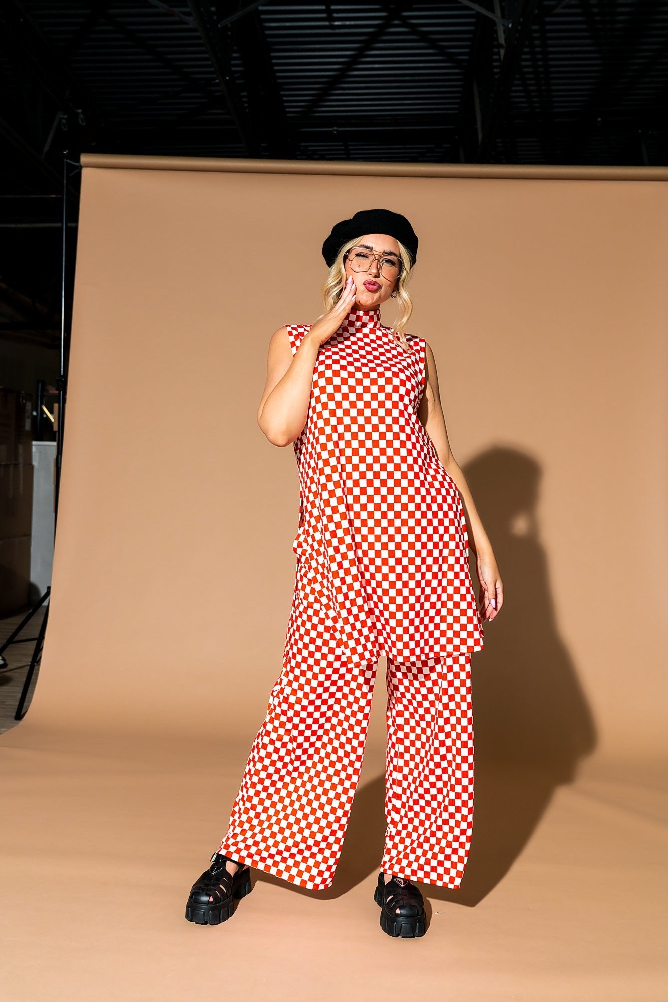 Gigi Sleeveless Ribbed Playsuit in Retro Red Check