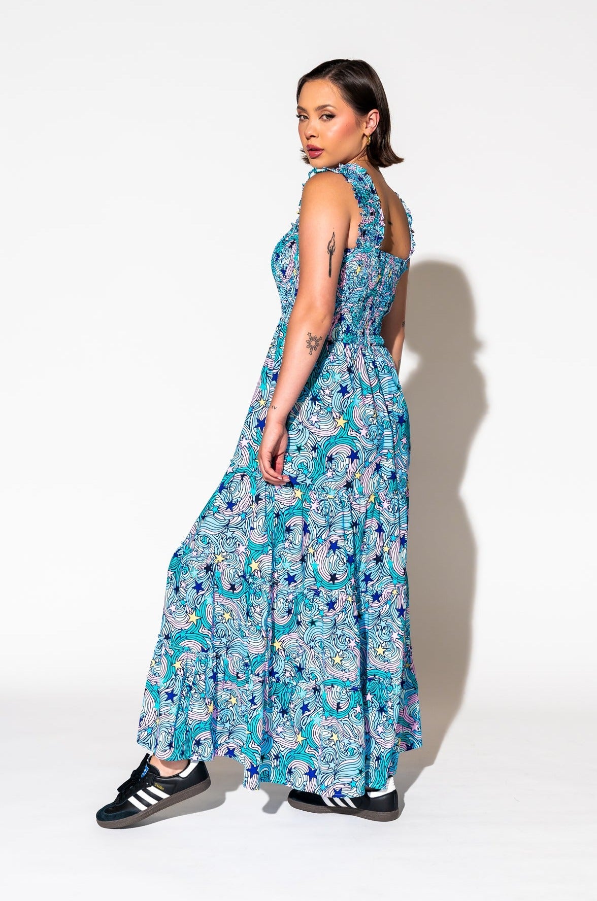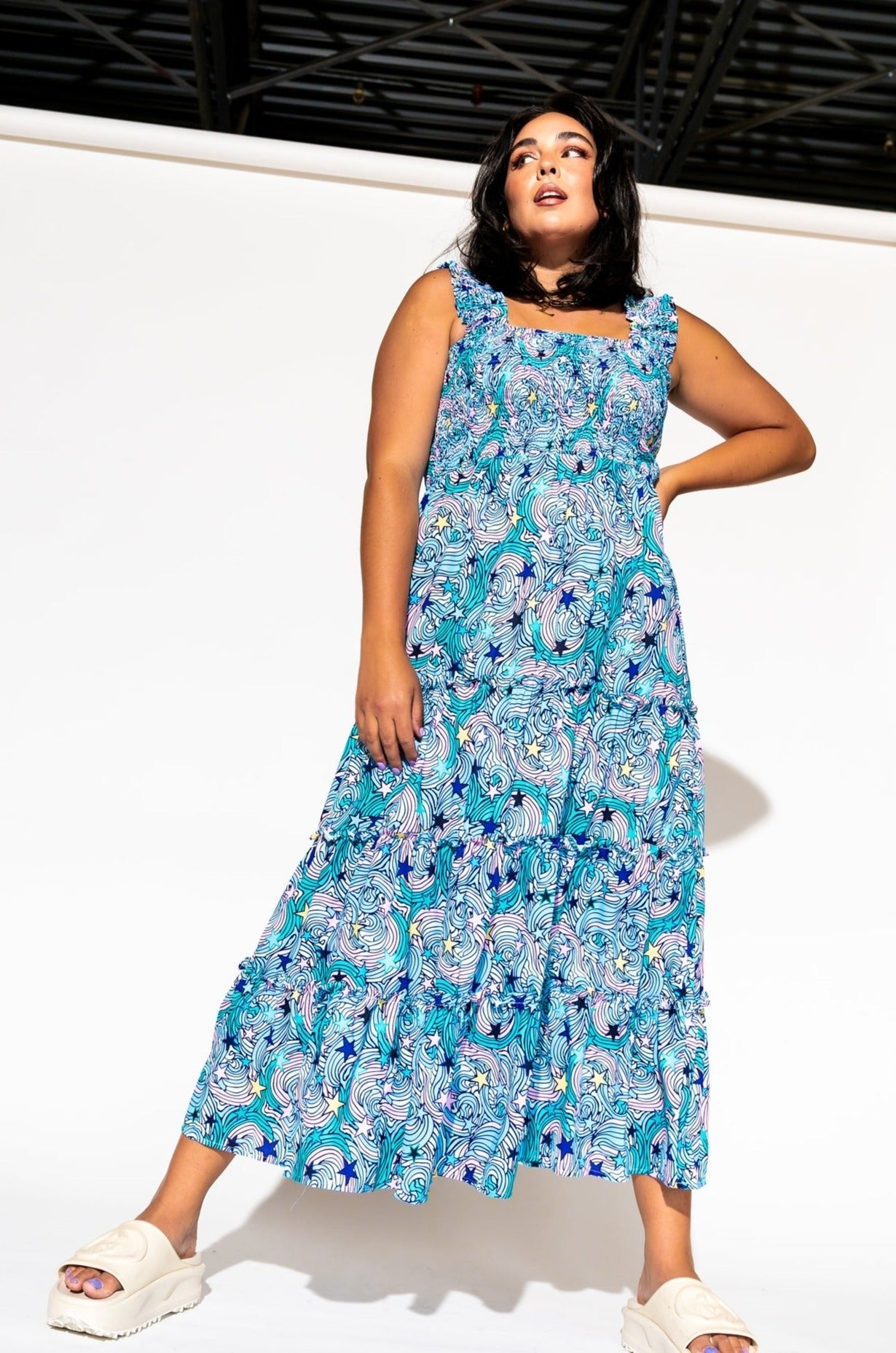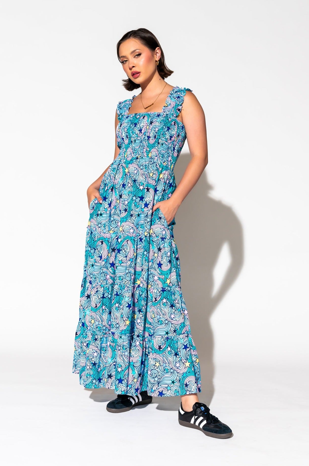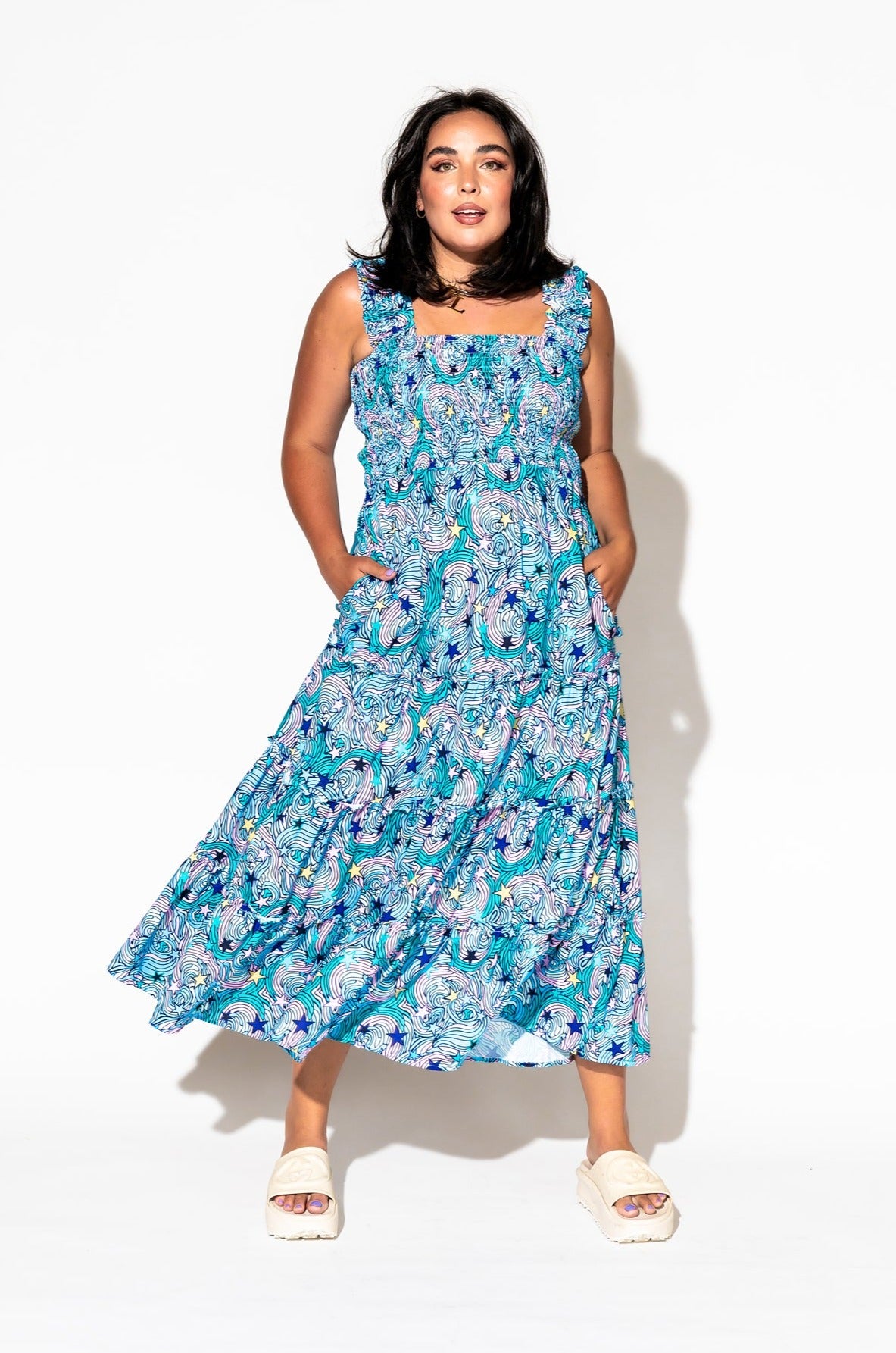 - Wide smocked shoulder straps