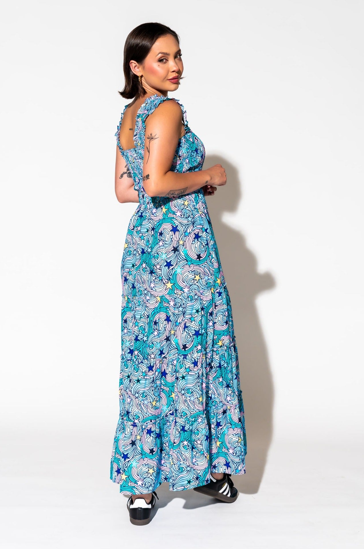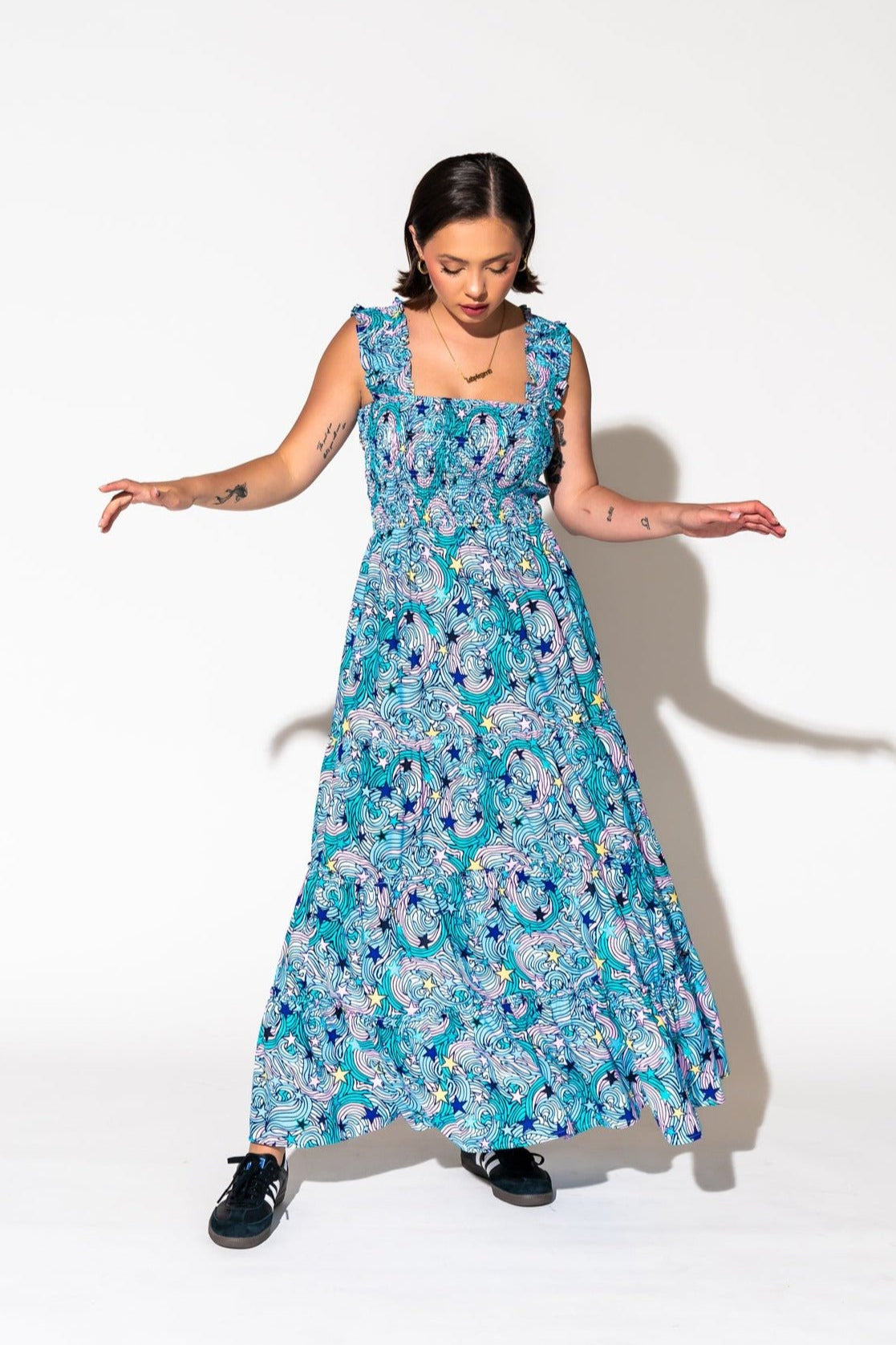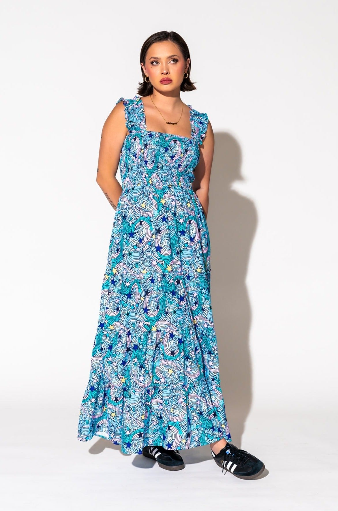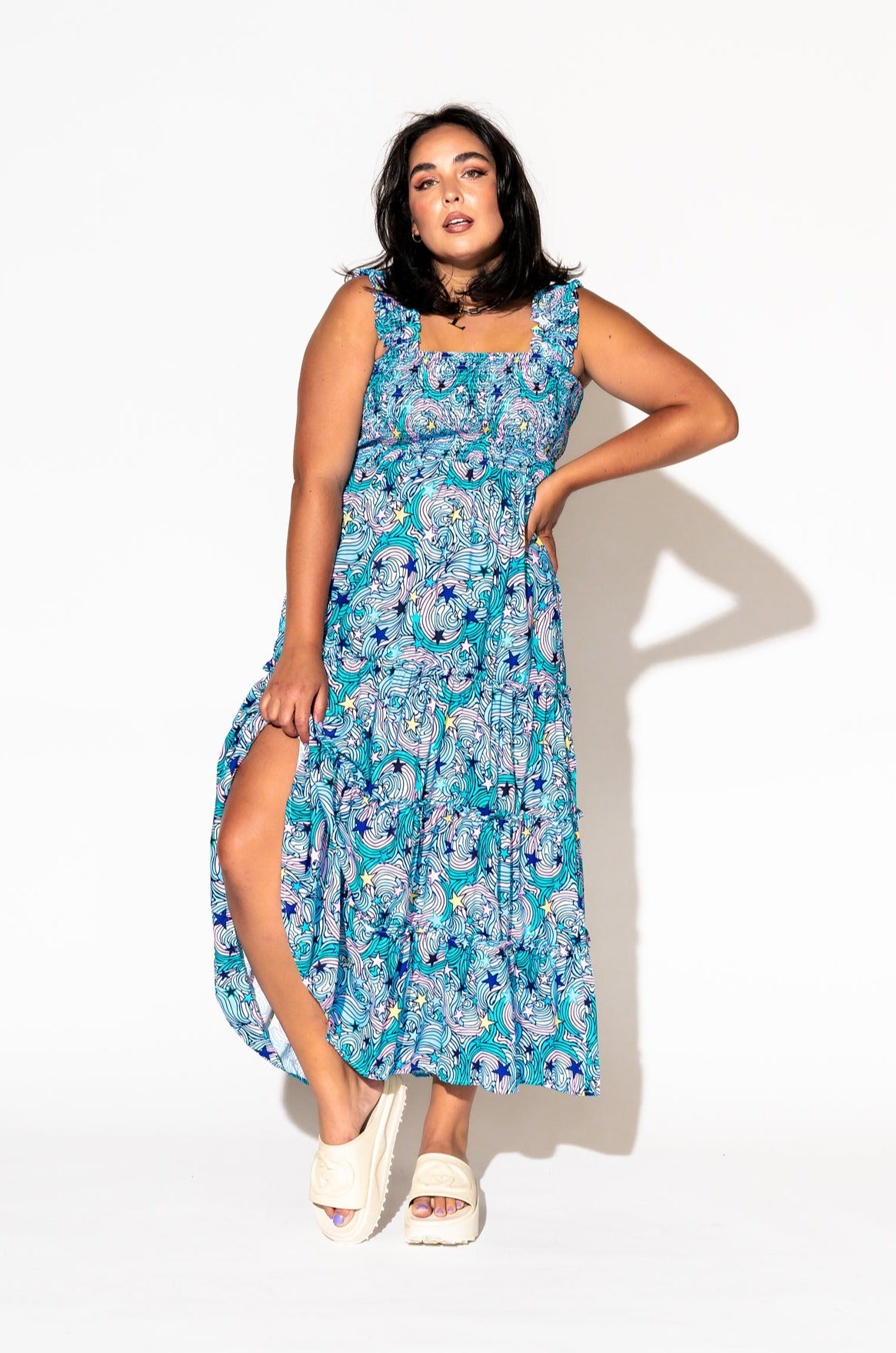 - Wide smocked shoulder straps