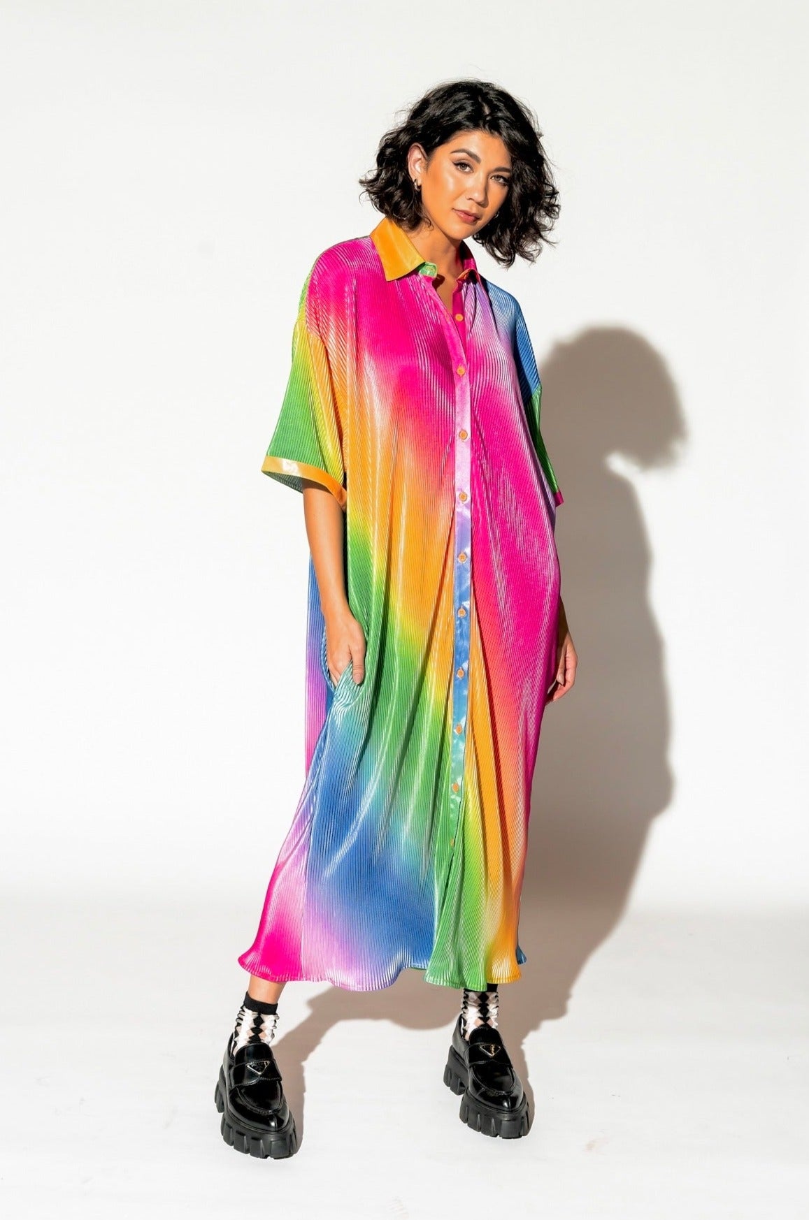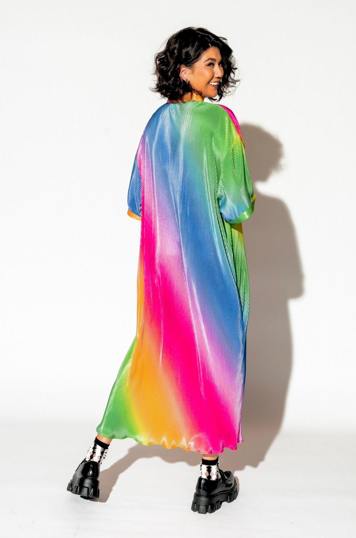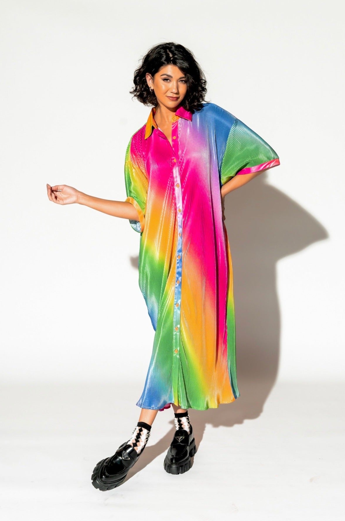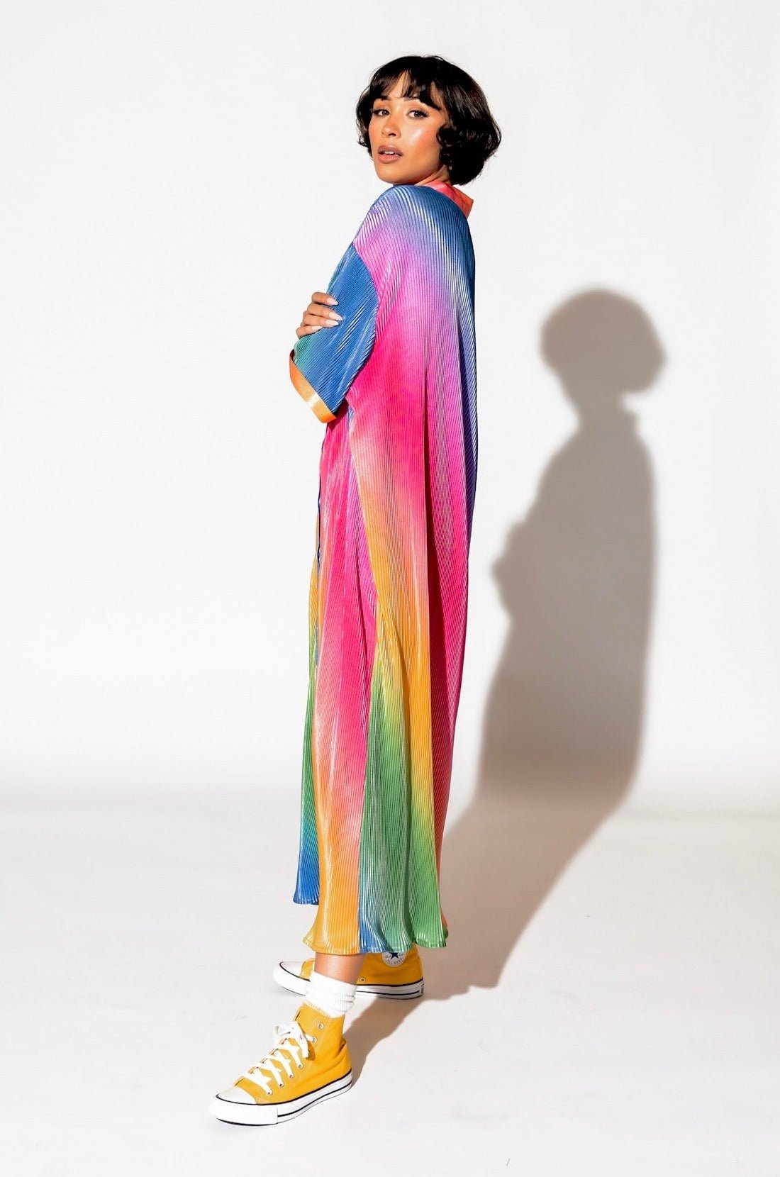 So Far So Good Oversized Plissé Dress in Prismatic Rainbow