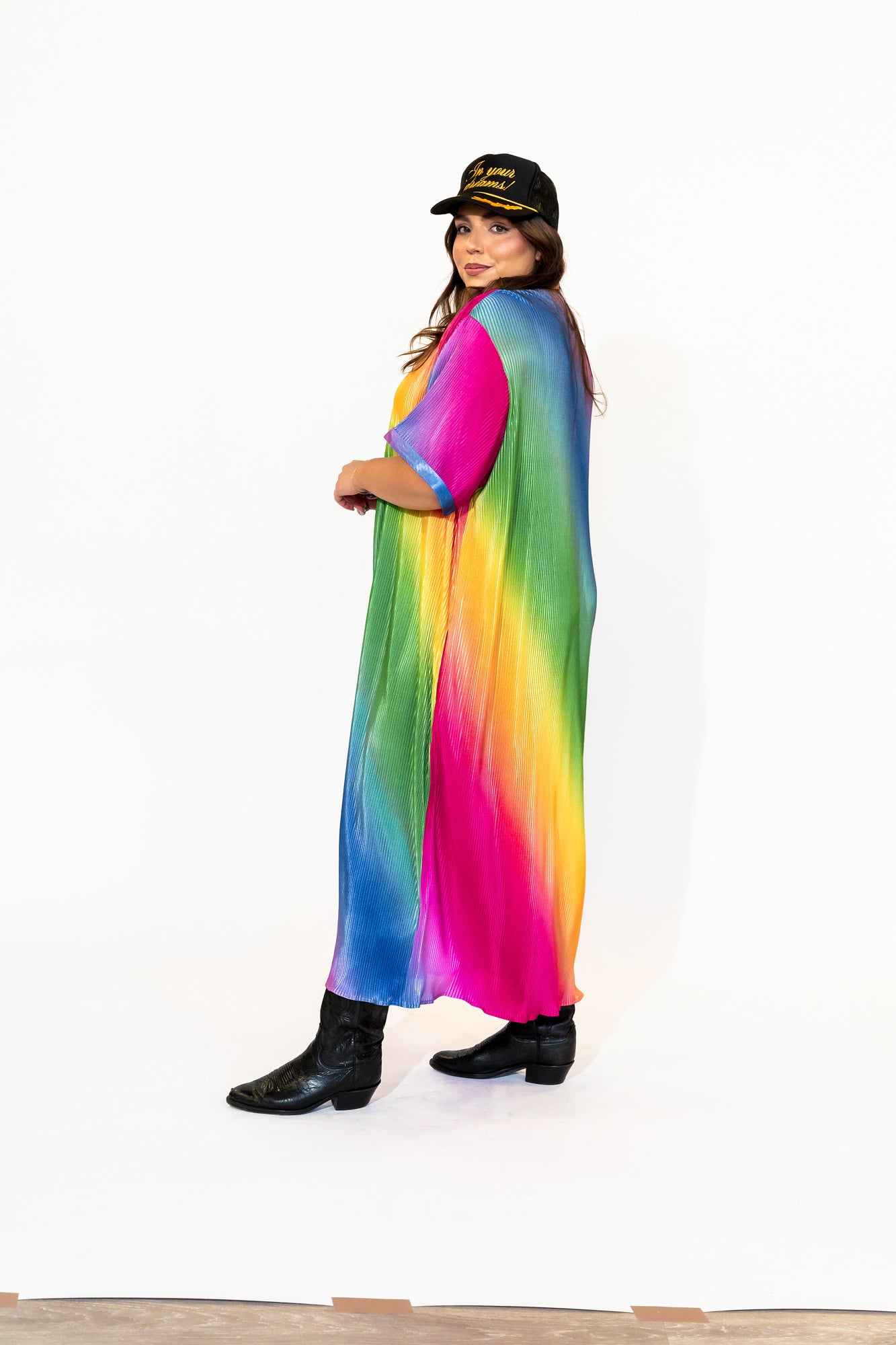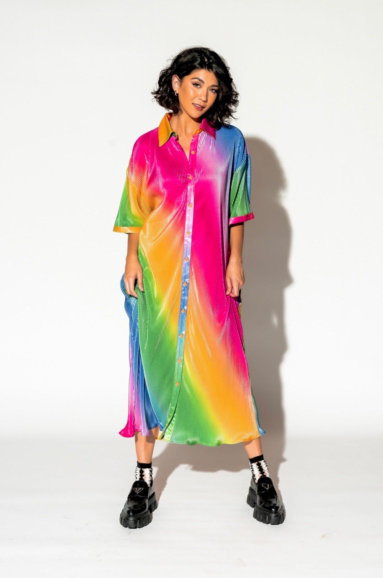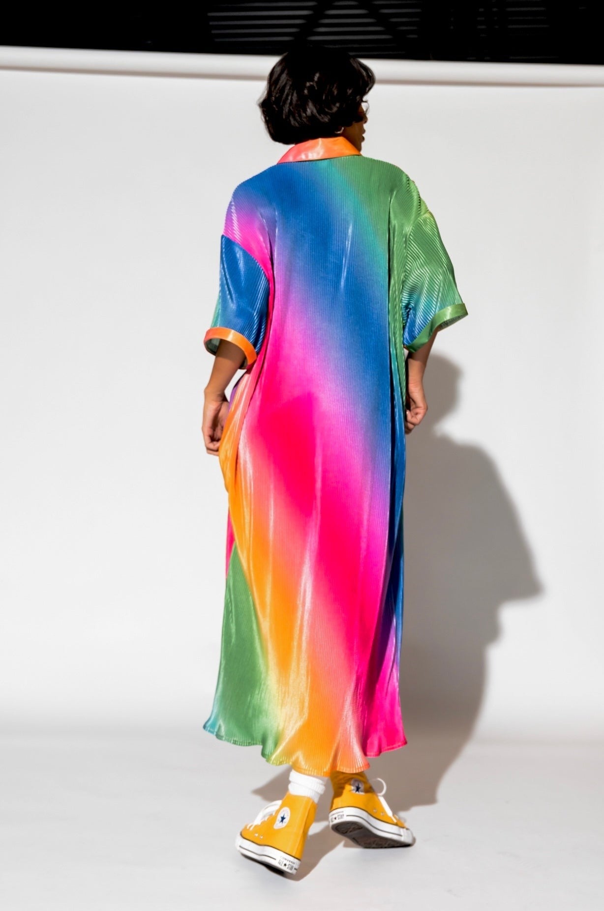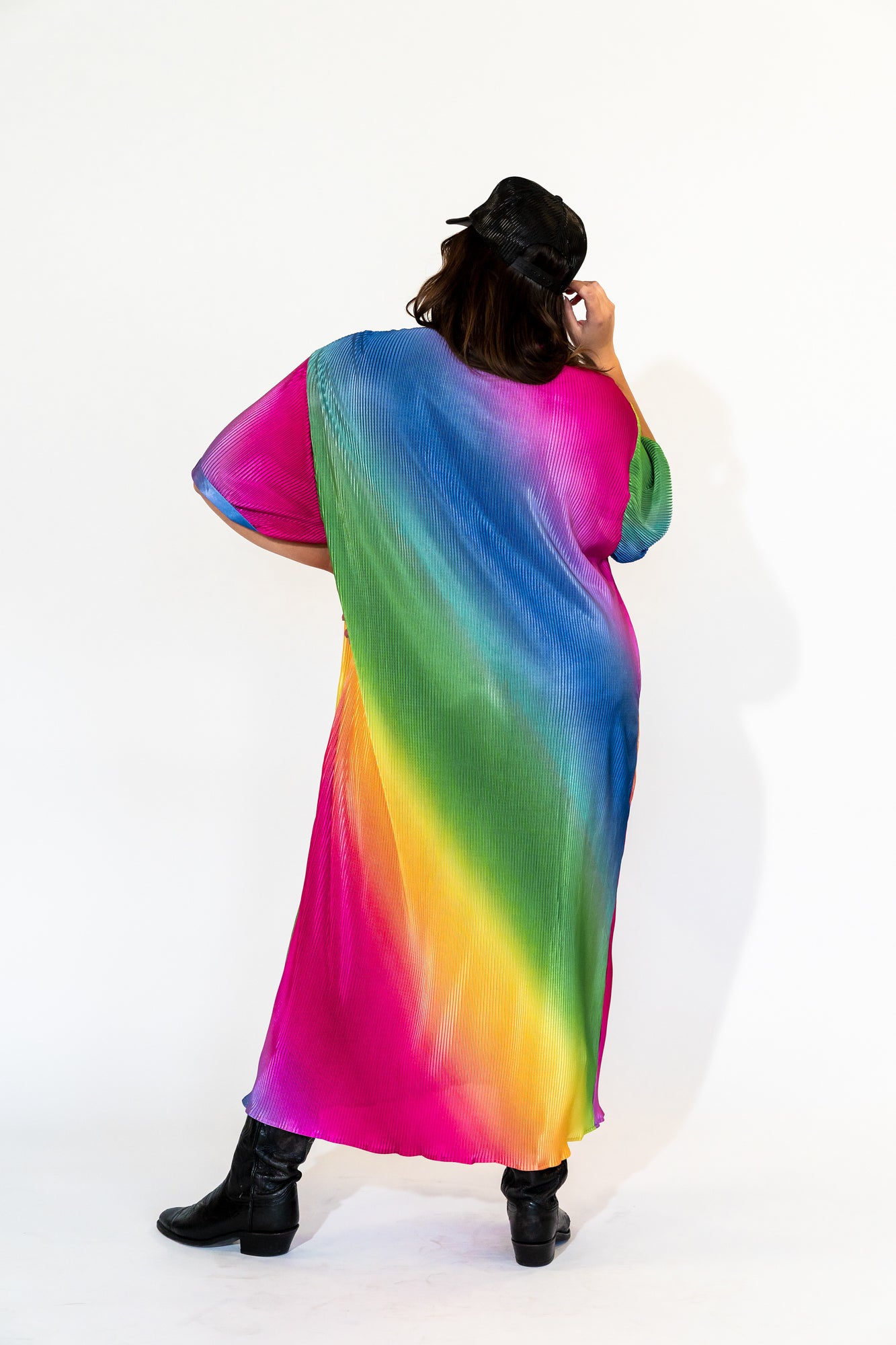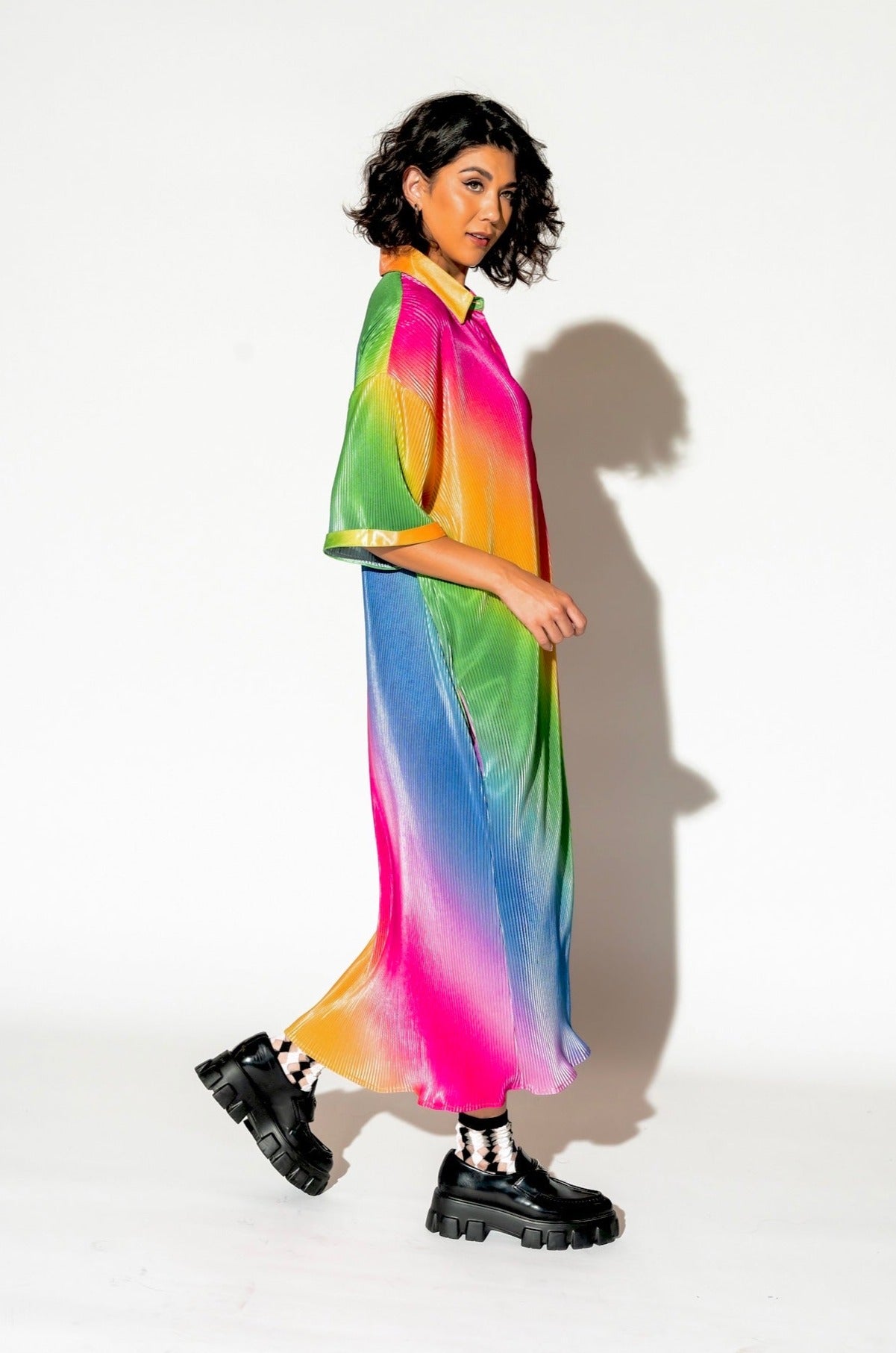 So Far So Good Oversized Plissé Dress in Prismatic Rainbow