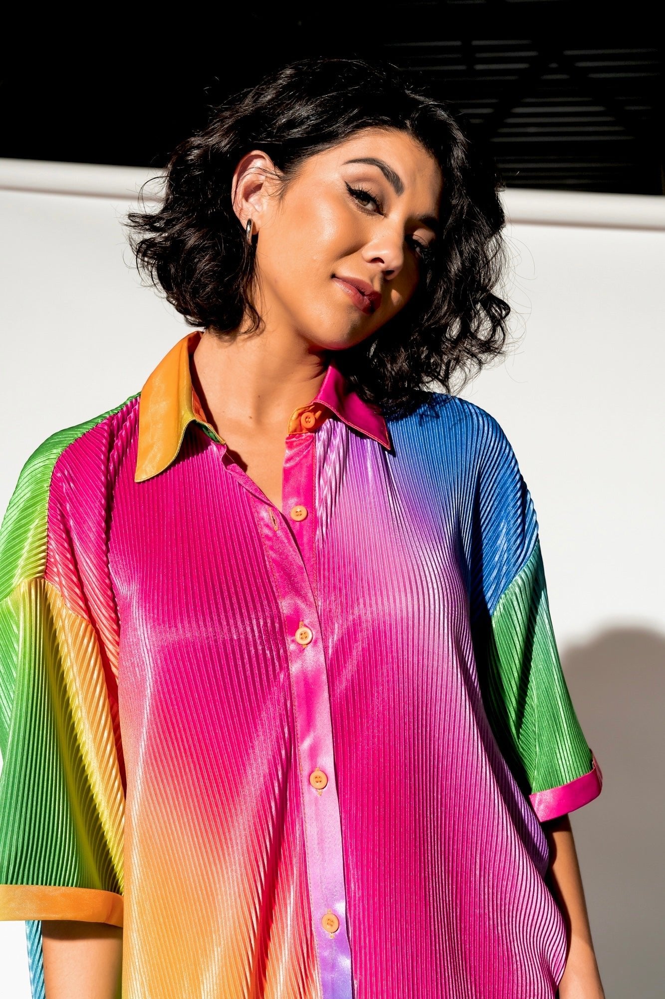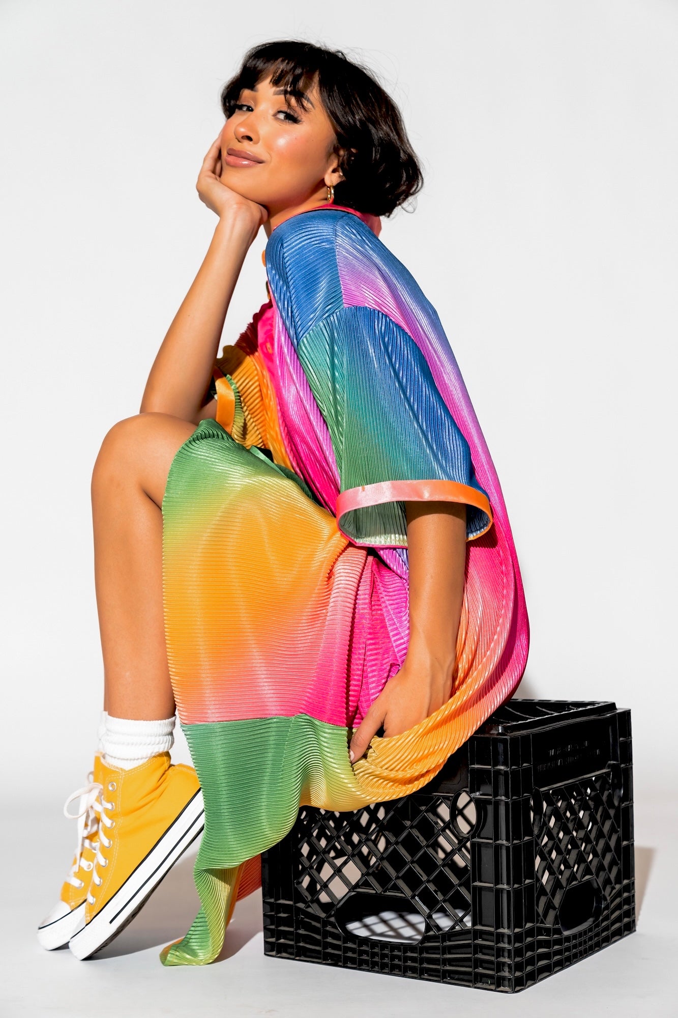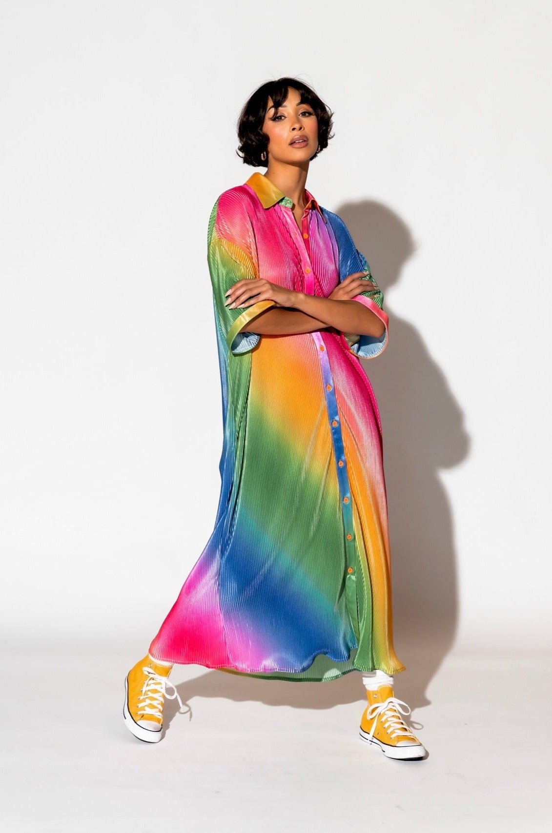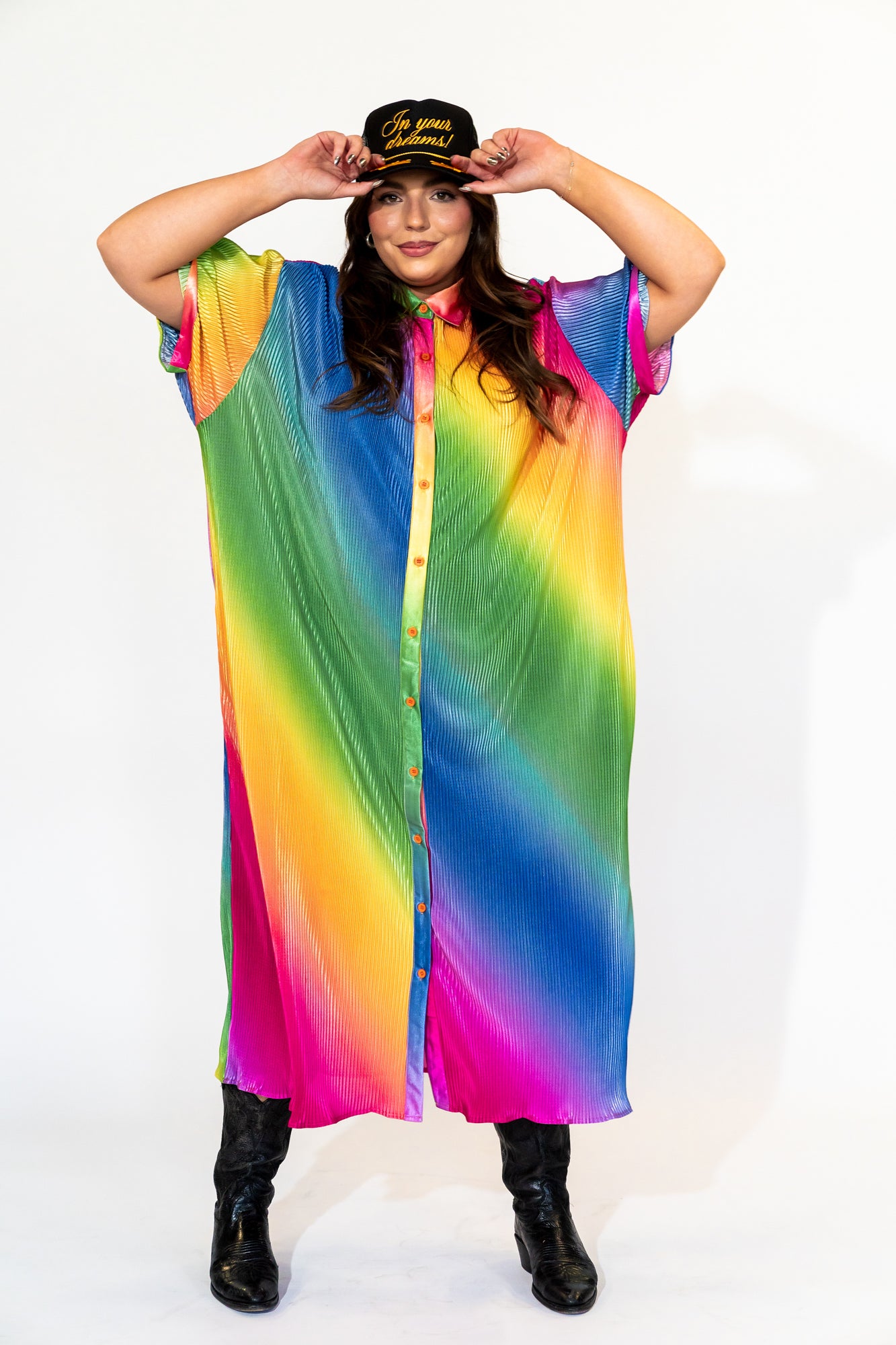 So Far So Good Oversized Plissé Dress in Prismatic Rainbow